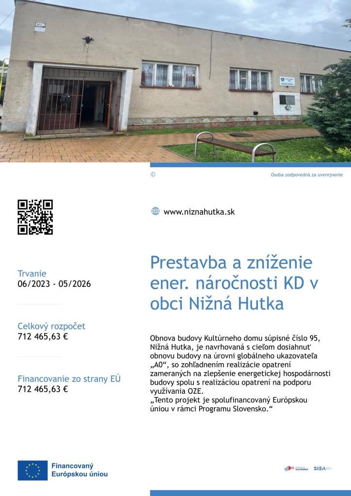 Poskytnutie NFP - Prestavba a zníženie energetickej náročnosti Kultúrneho domu v obci Nižná Hutka - 712 465,63 EUR.